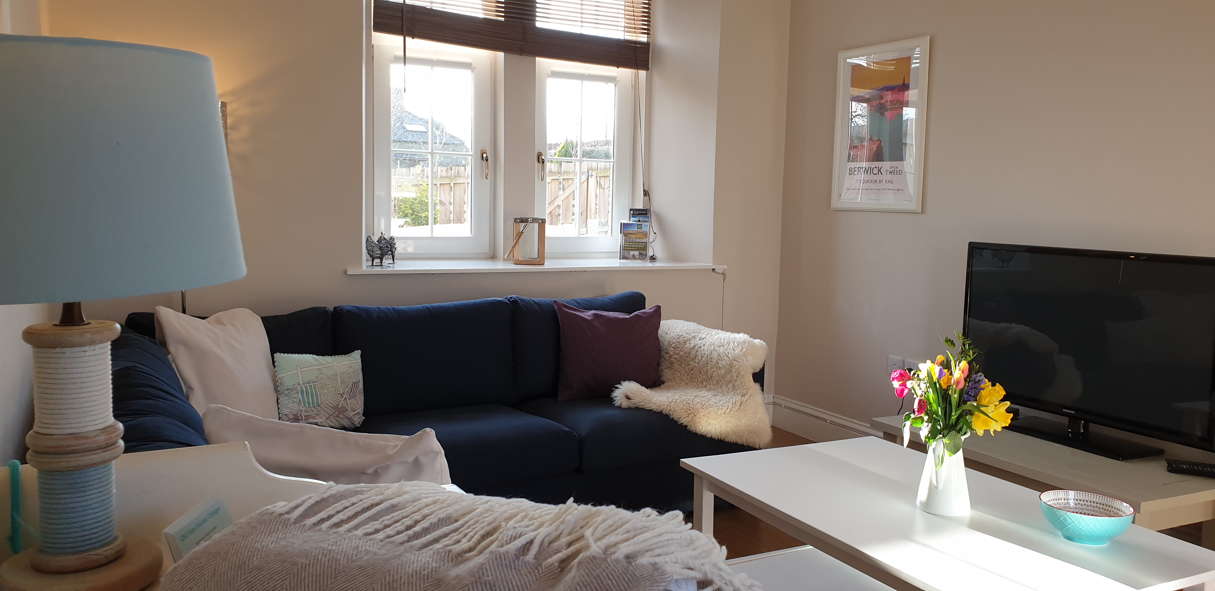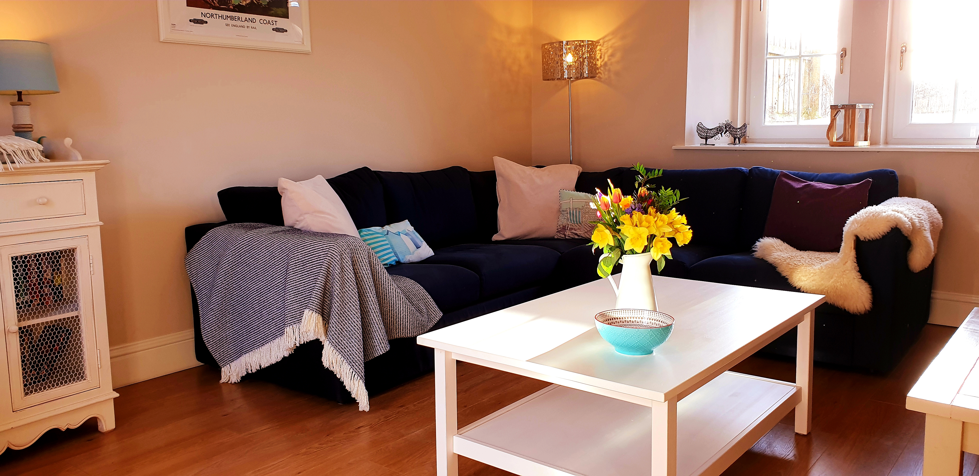Living room -with corner sofa, coffee table, views of the garden reading lamp, 42 inch TV, DVD player, DAB radio, DVDs, books, and some magazines.