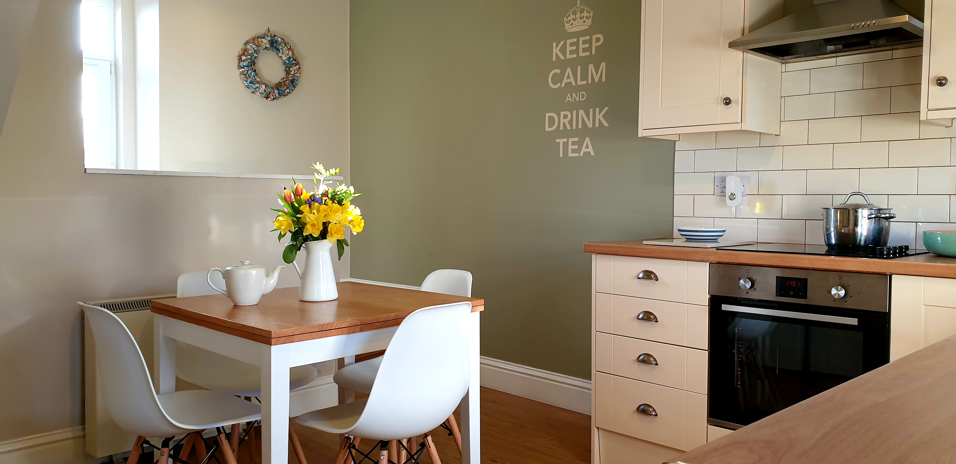 Kitchen equipment is provided, including all crockery, cutlery, and glasses, tea towels and oven glove. Dining area seating 4.