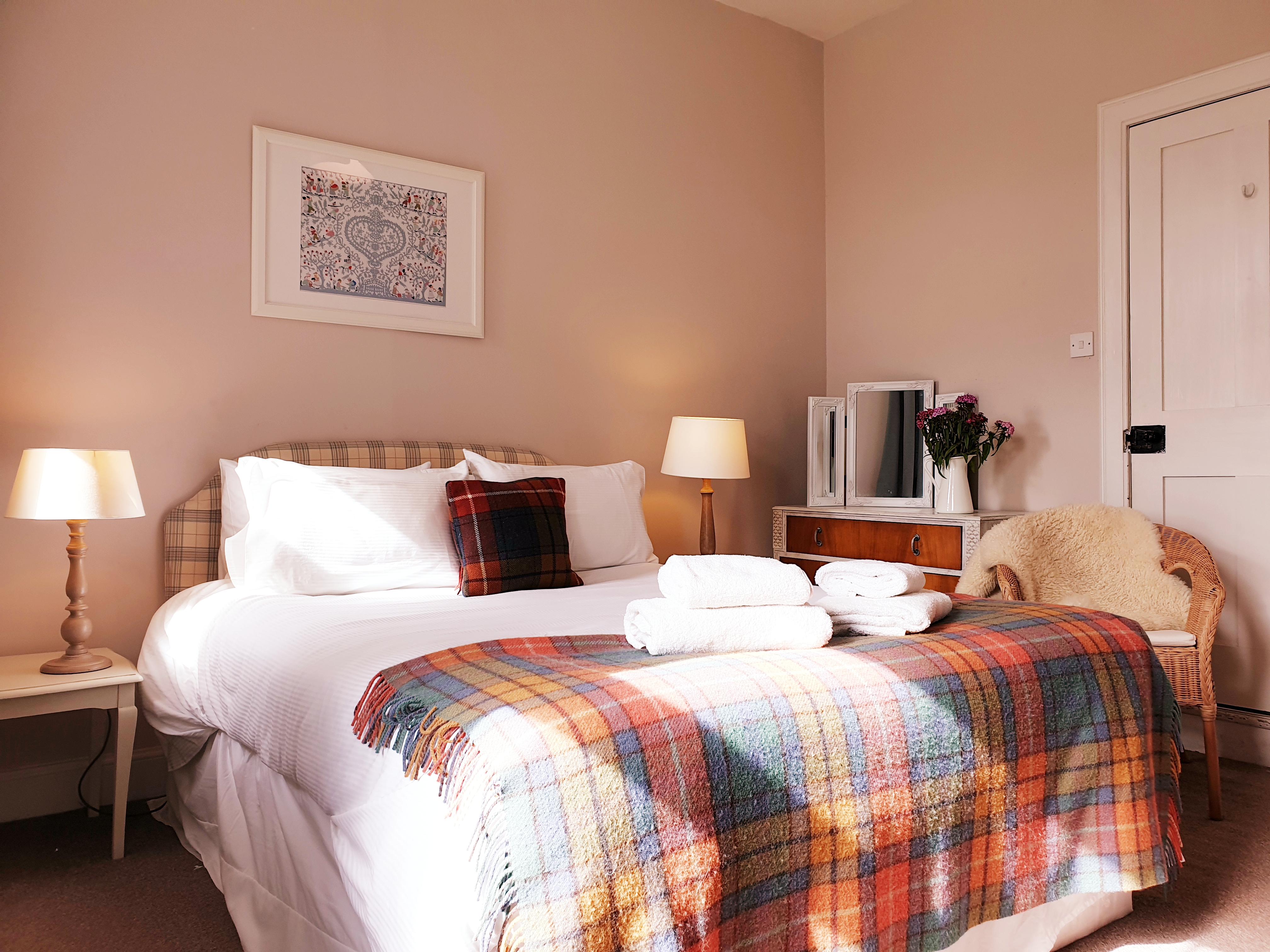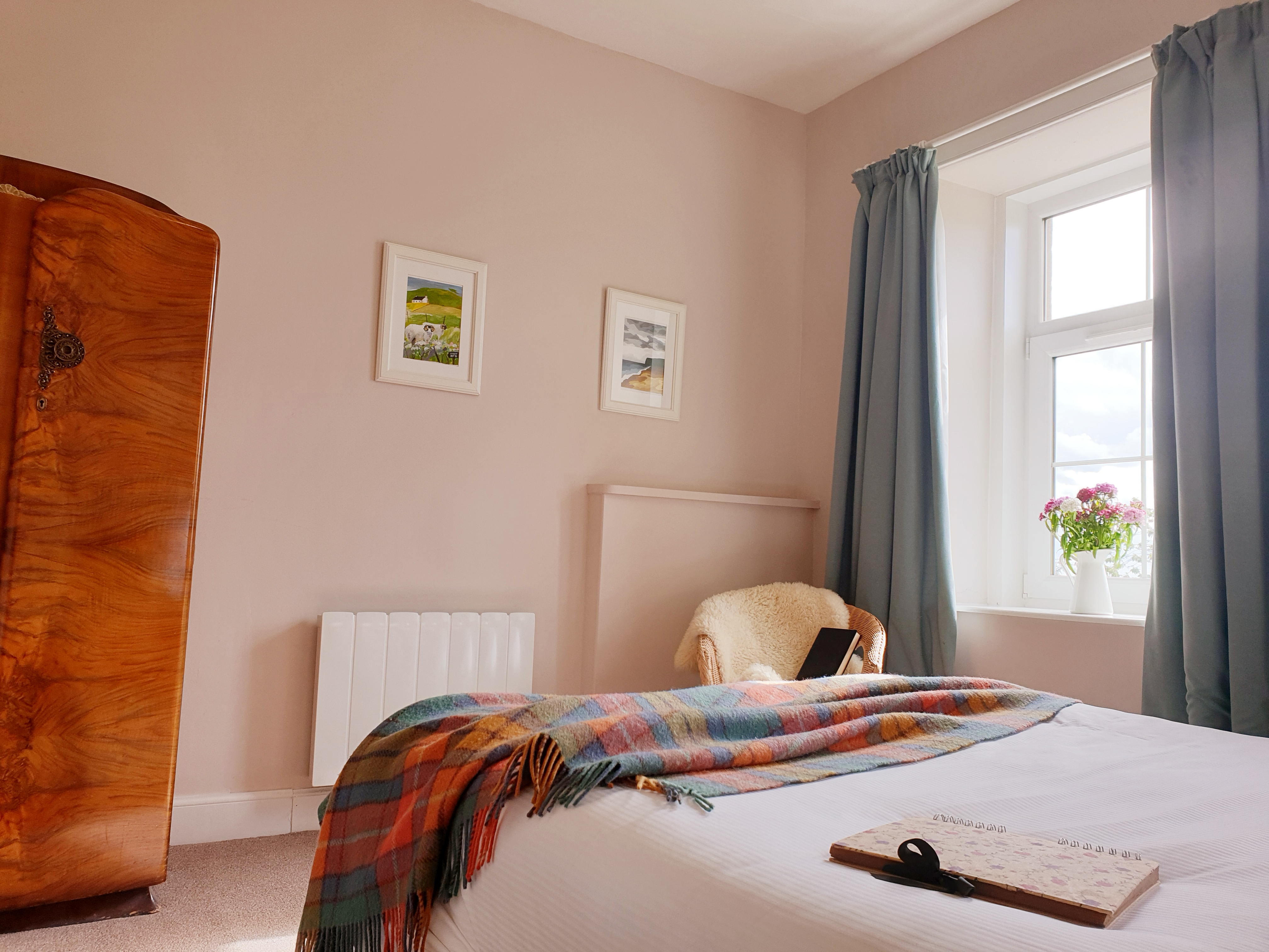 As part of the Old Maines Farmhouse, this was once the maid’s end of the house. Being delightfully renovated, Northend has a fun and homely feel. The living room and dining-kitchen are well-appointed with a door out to the private courtyard garden. A luxurious bathroom with a roll-top bath and original fireplace will help you relax & unwind. The Master bedroom has a king-size bed. Stunning views to the Cheviot and Eildon Hills.