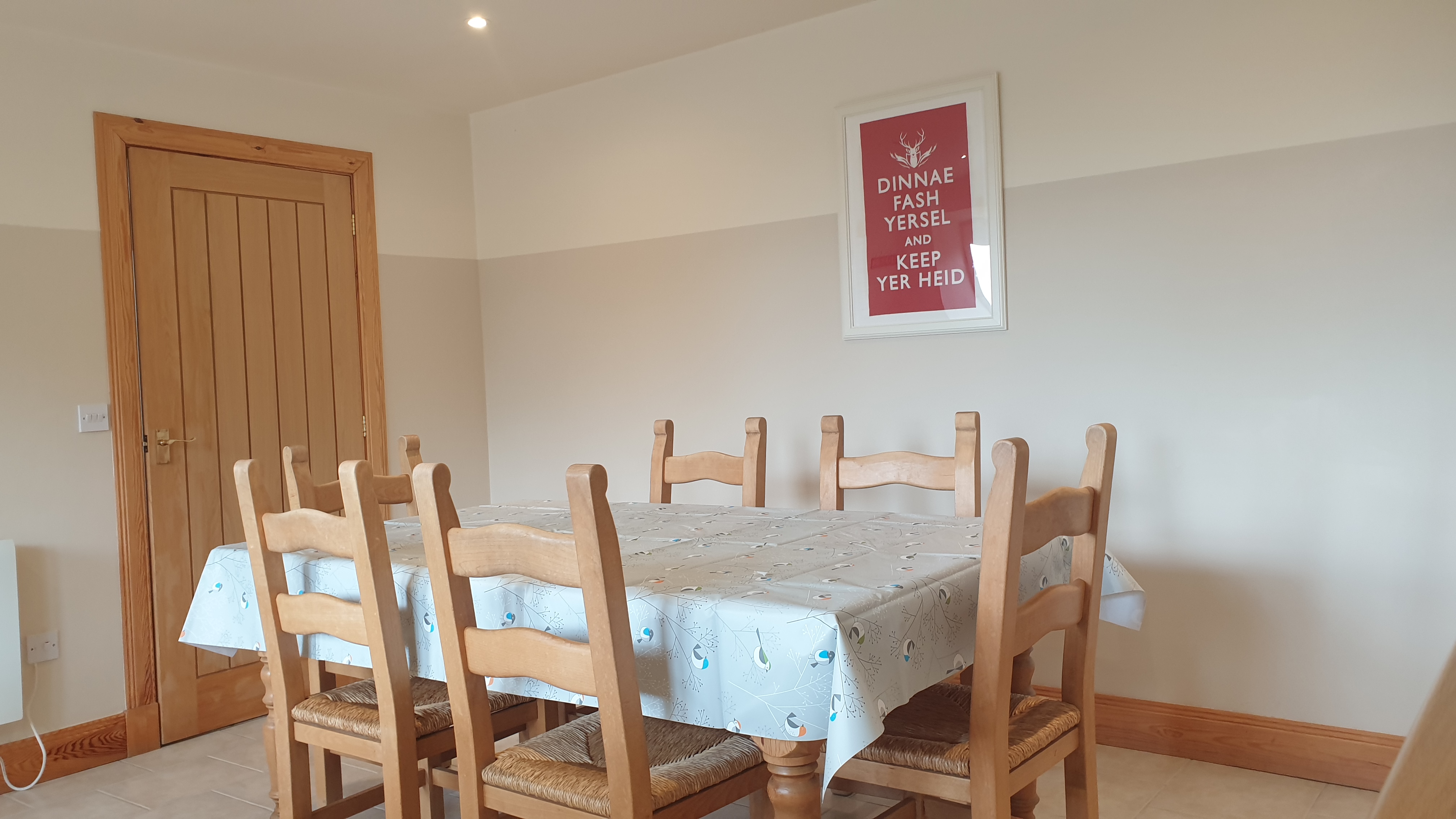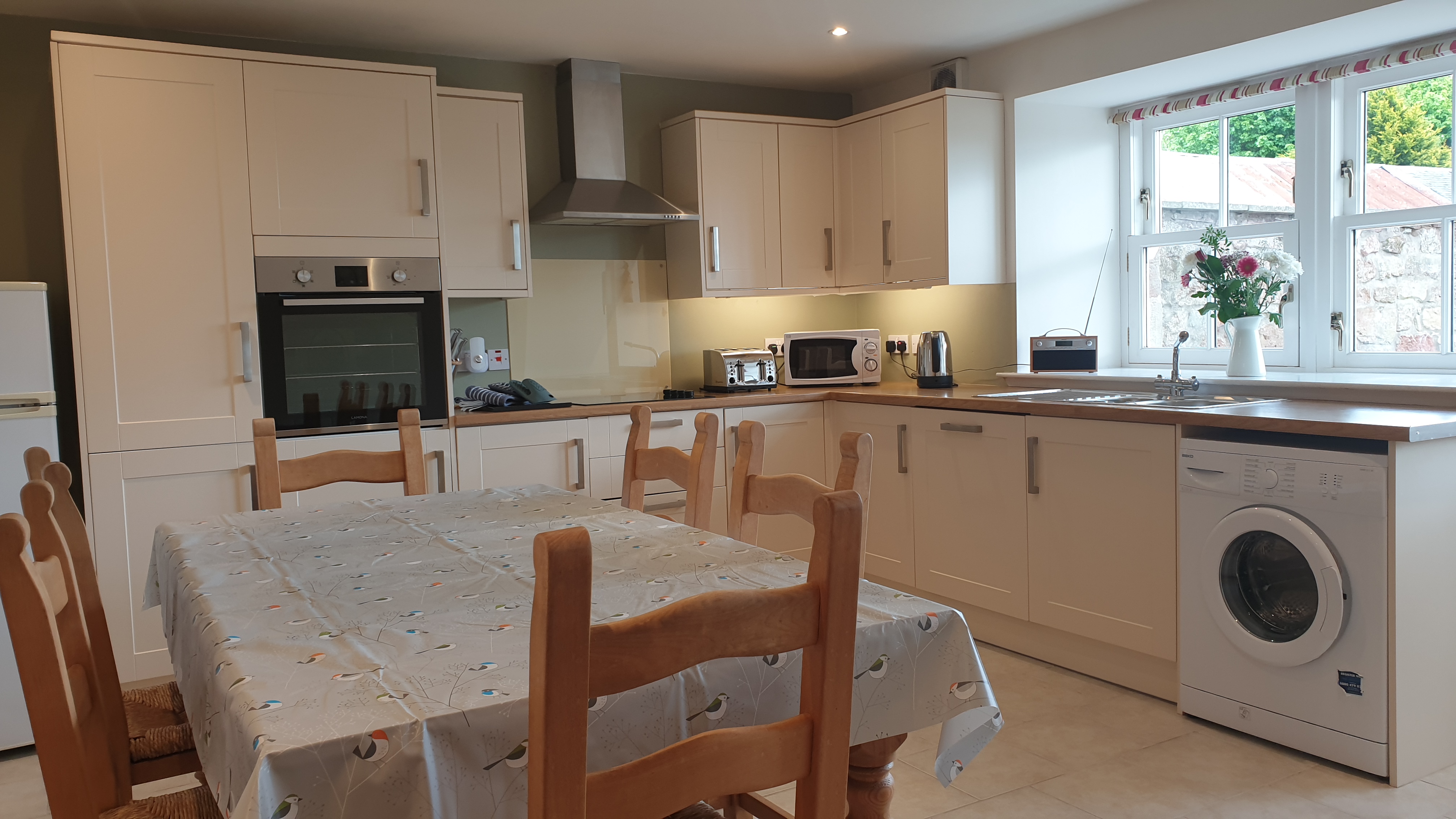 Kitchen with electric fan oven, 4 ringed ceramic hob range cooker, microwave, kettle, toaster, fridge freezer, dishwasher & washing machine, DAB radio. Kitchen equipment is provided, including all crockery, cutlery, and glasses. Dining area seating 6.